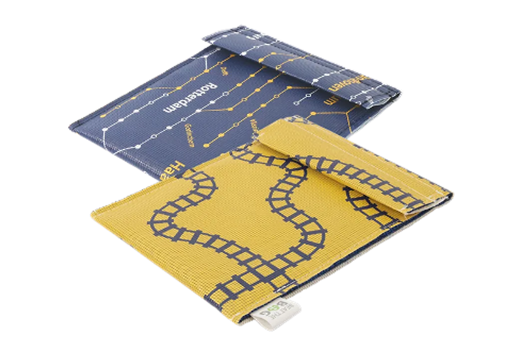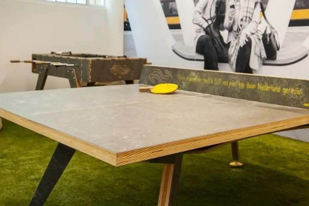 Old NS products are given a new purpose through upcycling. For example, train seat upholstery is transformed into bags and shoes. The yellow travel information boards are turned into notebooks and trays. Even old train floors get a new lease of life as furniture!