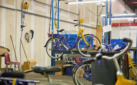Kunnen we een OV-fiets zelf niet meer repareren? Dan brengen we hem naar de sociale fietsenfabriek van Roetz. Daar halen fietsenmakers de fiets volledig uit elkaar: tot meer dan honderd losse onderdelen. Al die onderdelen worden zorgvuldig gesorteerd.