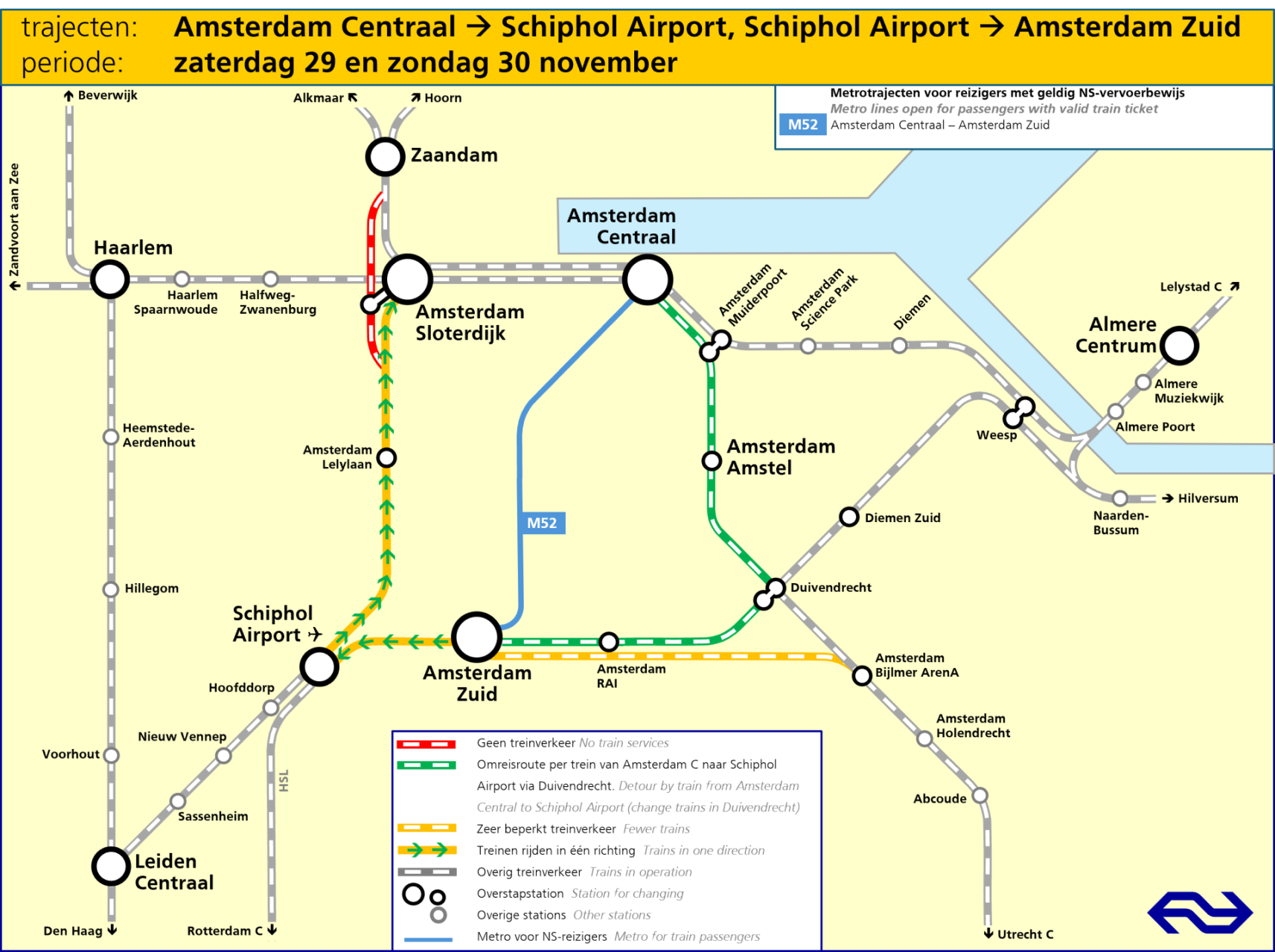 Op deze dagen rijden er heel weinig treinen van, naar en via Schiphol Airport. Van Schiphol Airport naar Amsterdam Centraal en van Amsterdam Zuid naar Schiphol Airport kan er maar in 1 richting gereisd worden.