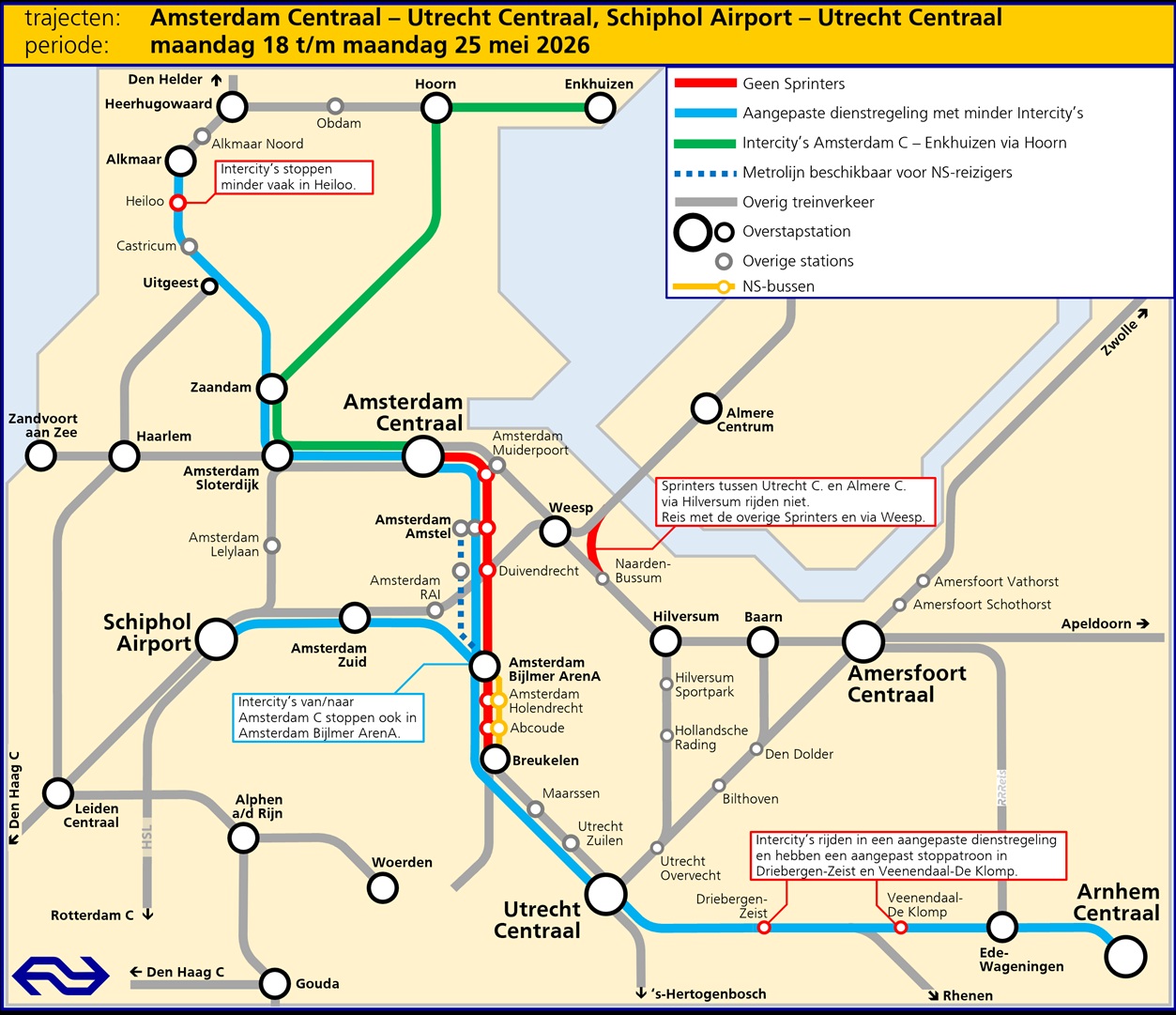 - Minder Intercity’s tussen Utrecht Centraal – Amsterdam Centraal/Amsterdam Zuid – Schiphol Airport (4x per uur).