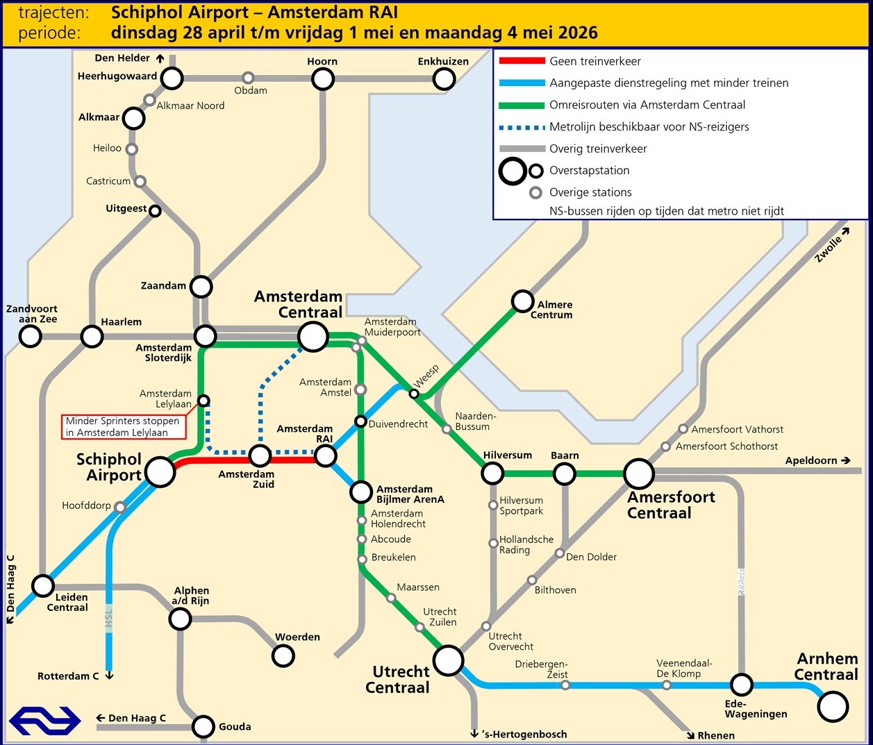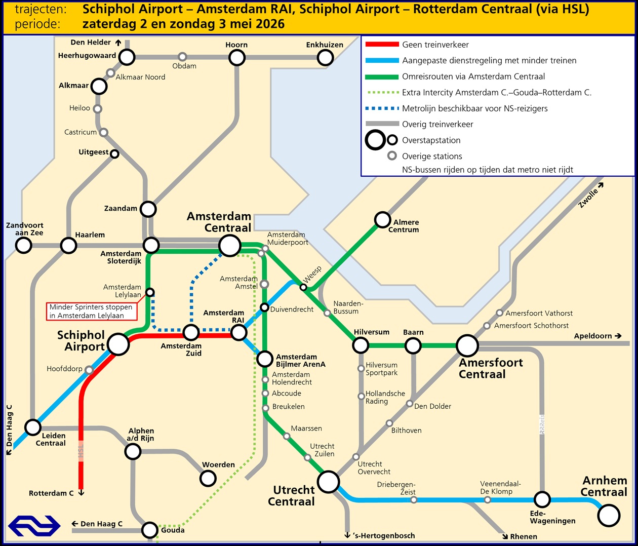 NS zet vervangend metrovervoer in. Je NS-vervoerbewijs is geldig in metro 50 en 51 tussen Amsterdam RAI/Amsterdam Zuid en Amsterdam Lelylaan en in metro 52 tussen Amsterdam Centraal en Amsterdam Zuid.