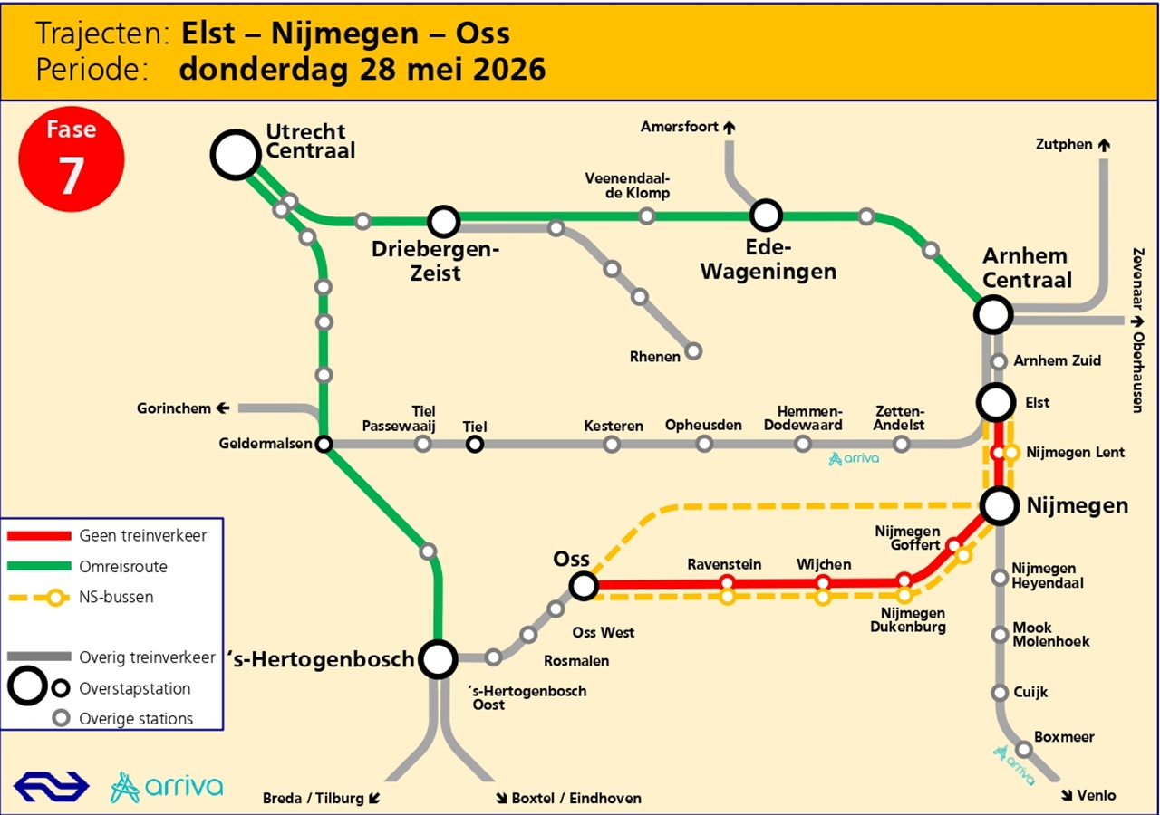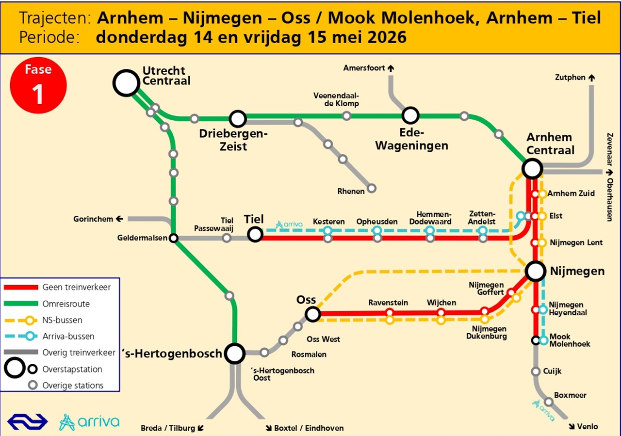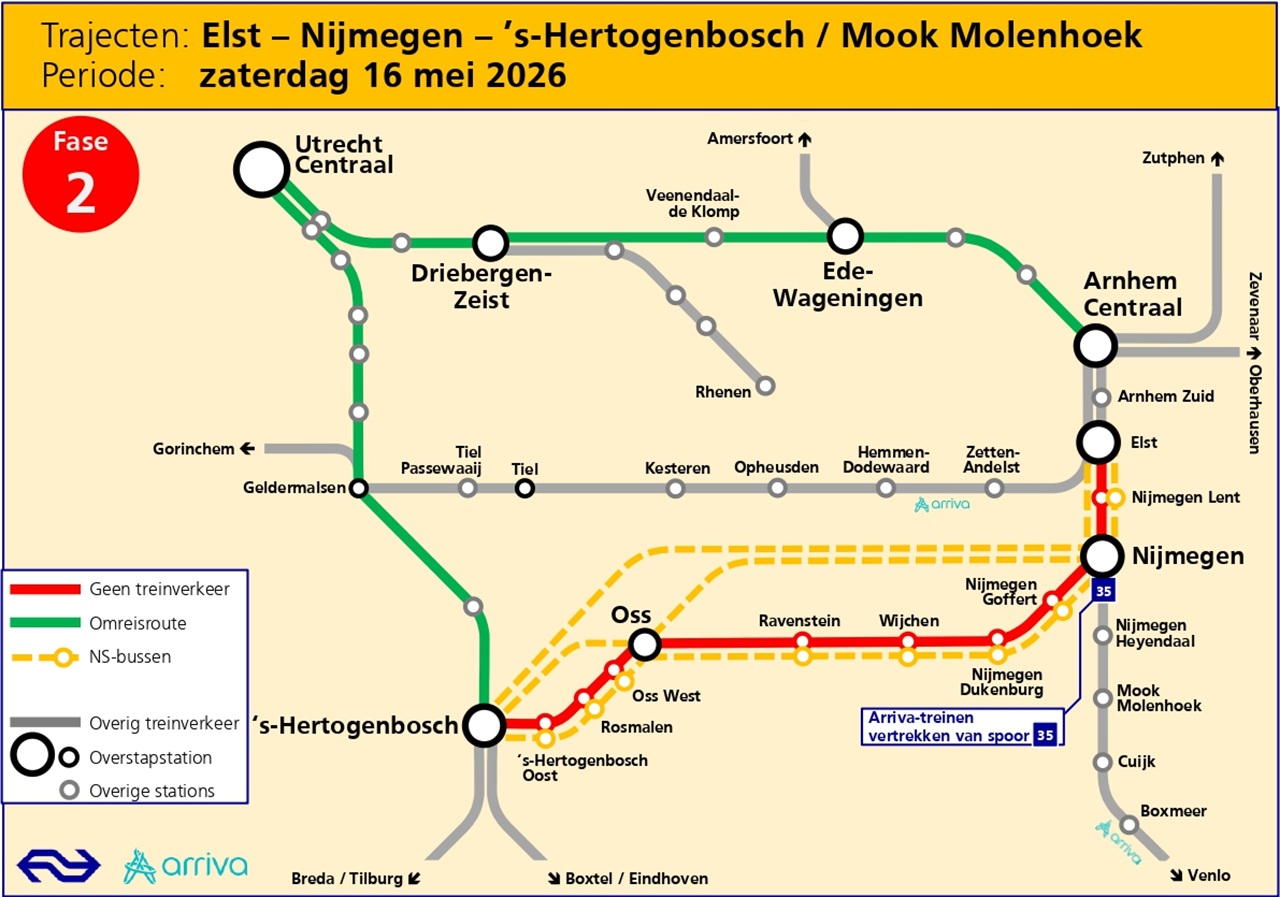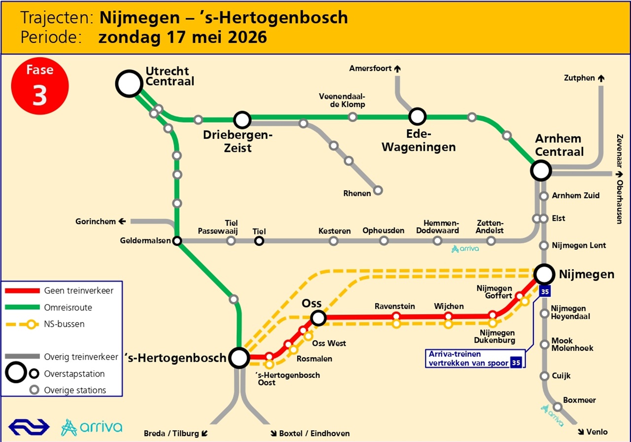 NS en Arriva en zetten bussen in om reizigers naar hun bestemming te brengen. Houd rekening met extra reistijd.