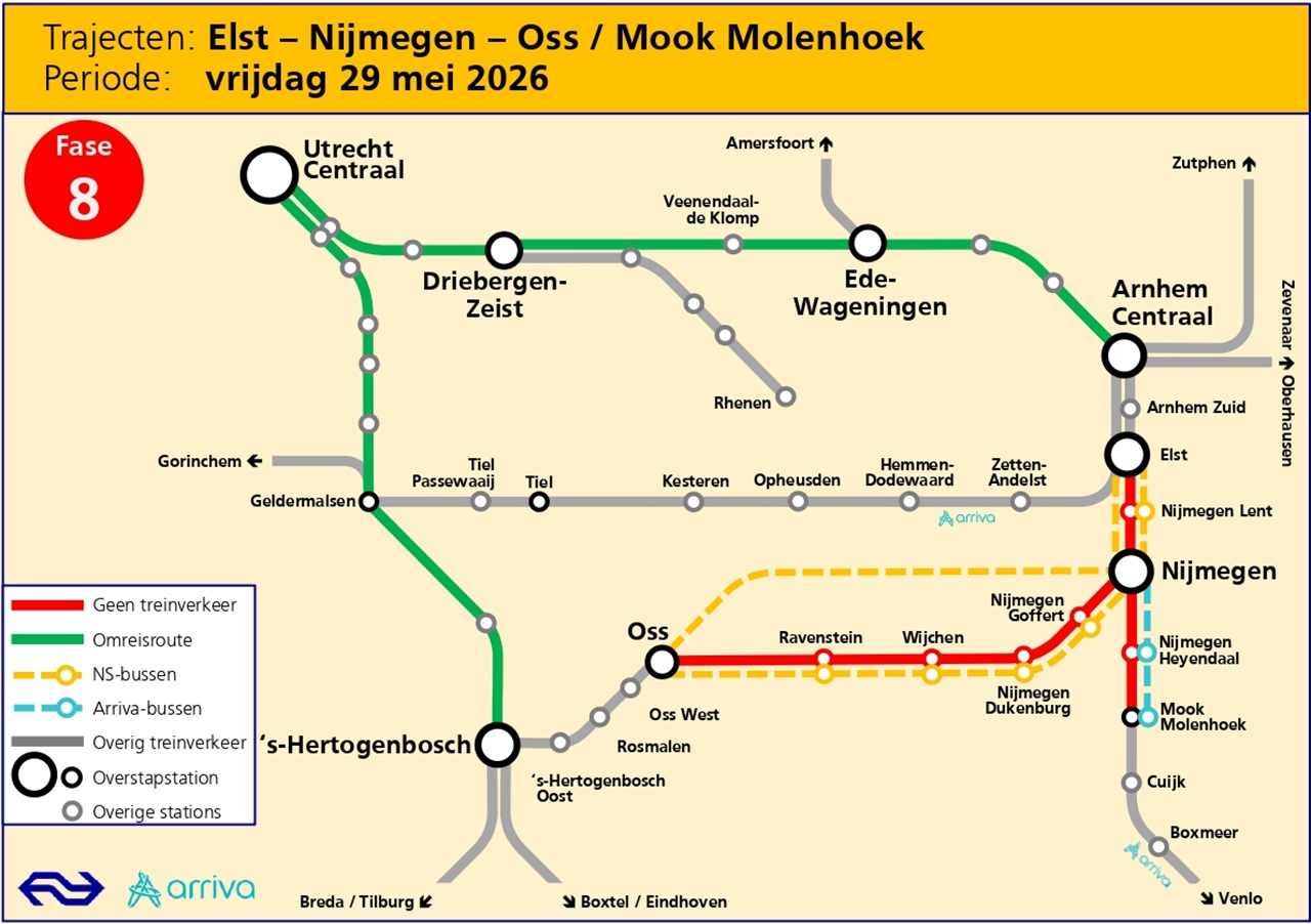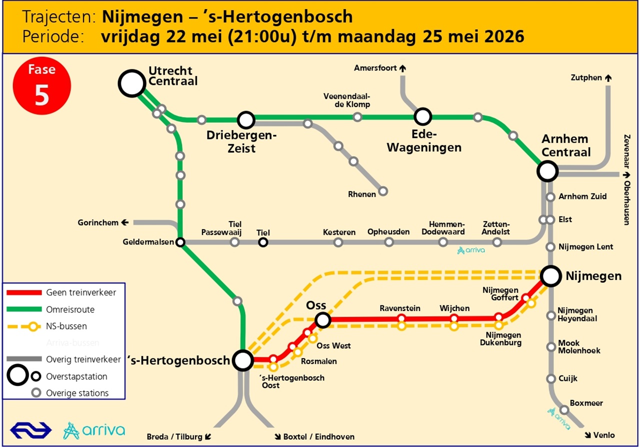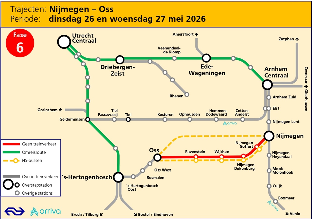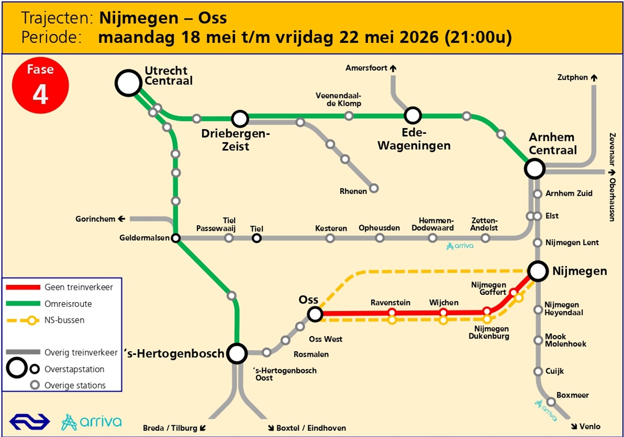 NS en Arriva en zetten bussen in om reizigers naar hun bestemming te brengen. Houd rekening met extra reistijd.