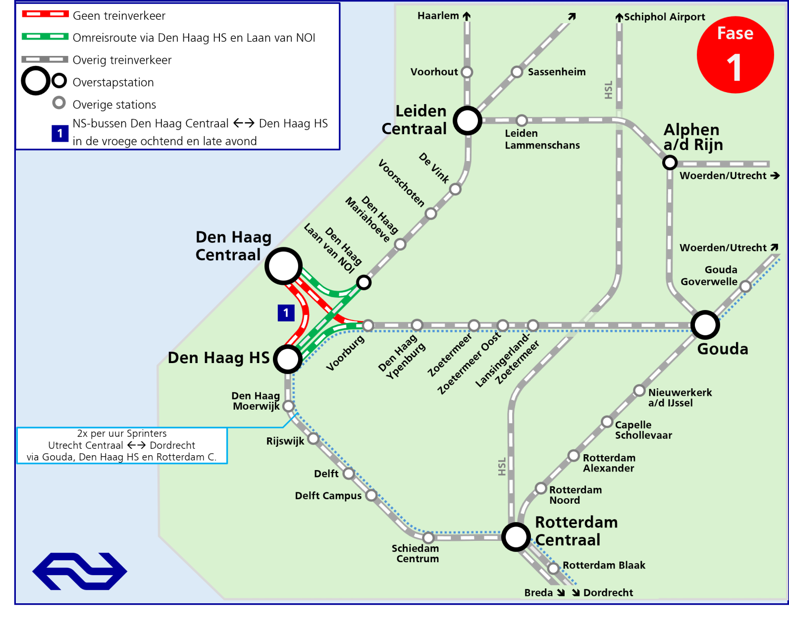 Reis je vanuit Den Haag Centraal richting Den Haag HS/Delft (of verder)? Reis dan om via Den Haag Laan van NOI. Reis je vanuit Den Haag Centraal richting Gouda/Utrecht (of verder)? Reis dan om via Leiden Centraal.