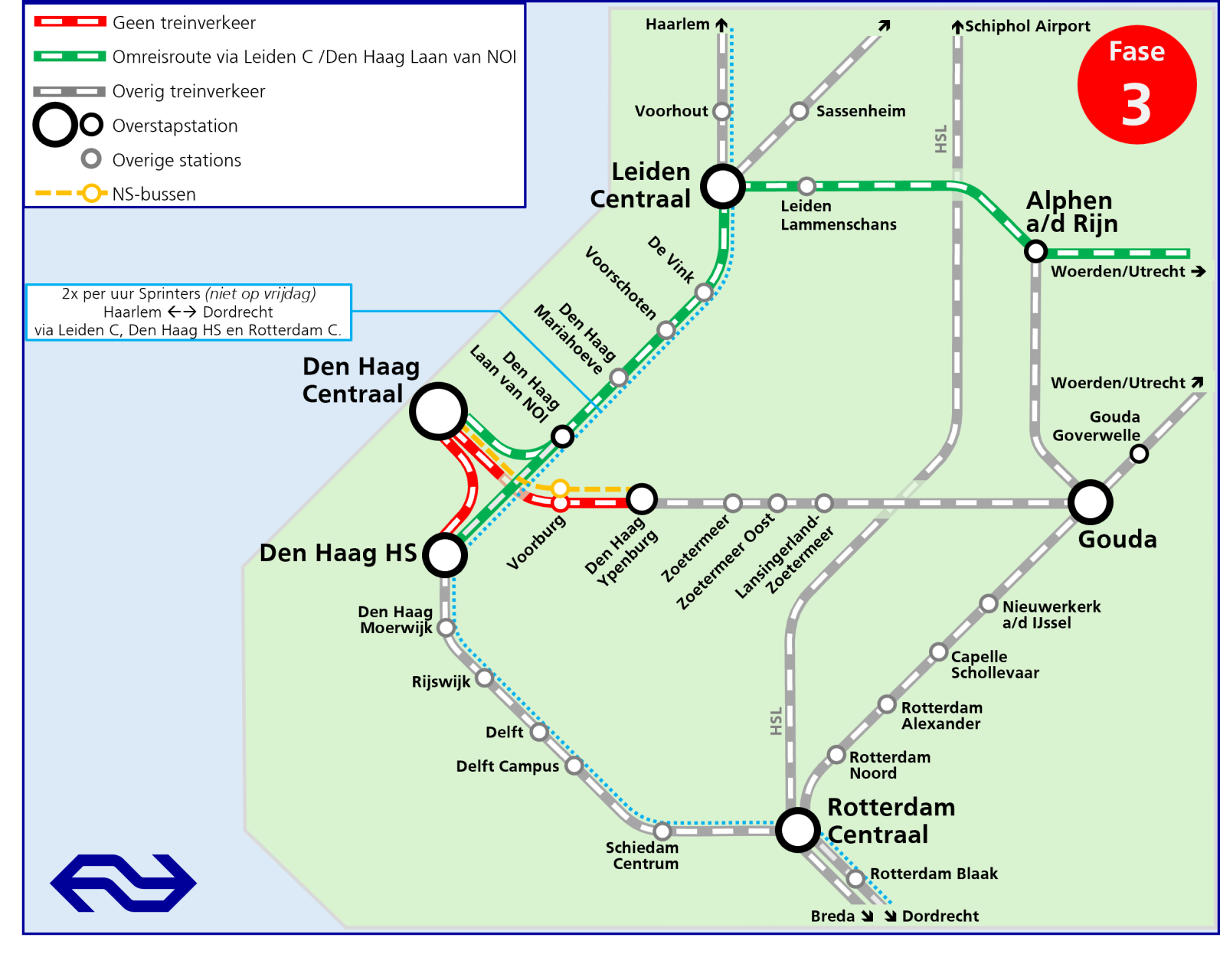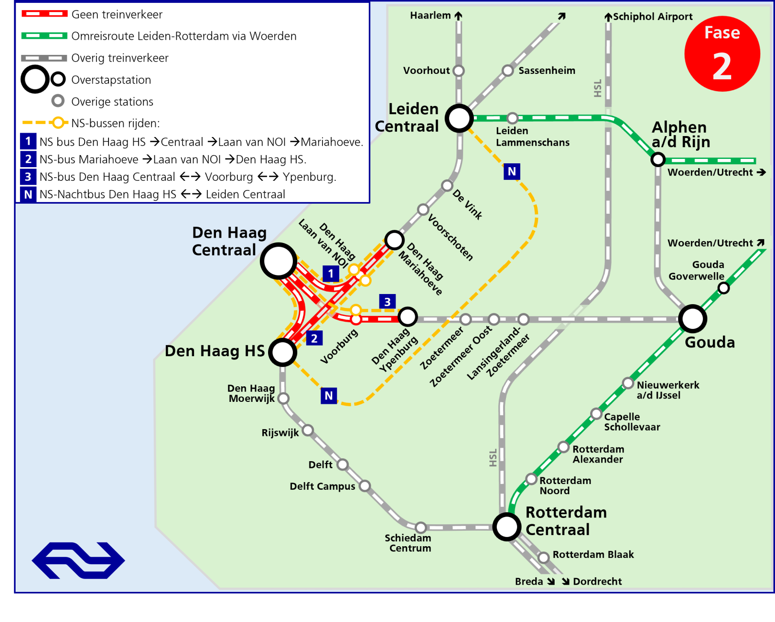 - Reis je vanuit Den Haag Centraal richting Den Haag HS/Delft (of verder)? Reis dan om via Den Haag Laan van NOI.