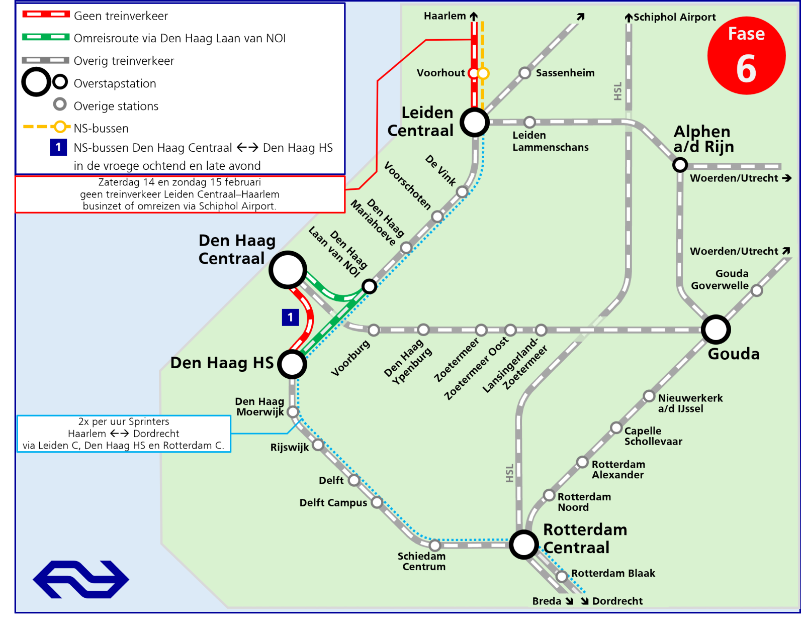 In de nacht van vrijdag 6 op zaterdag 7 februari rijden er geen treinen tussen Den Haag Centraal en Den Haag HS/Delft en tussen Delft/Den Haag HS – Leiden Centraal. Er rijden dan bussen.